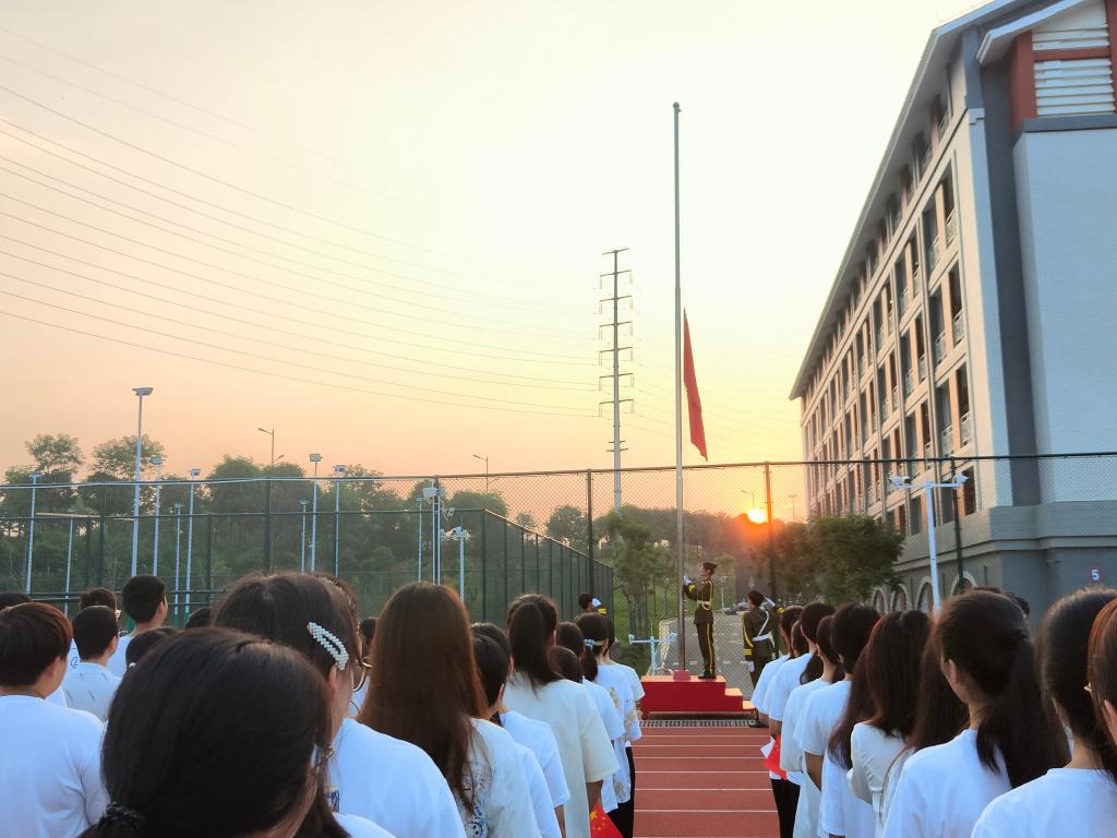 在全体师生的注目礼下,英姿飒爽的国旗护卫队队员们护送着鲜艳的五星红旗,伴随着庄严的中华人民共和国国歌,五星红旗冉冉升起,迎风飘扬。