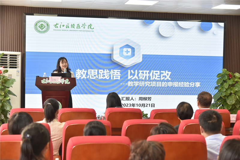 教学培训中,右医附院周柳芳副教授首先以《教思践悟 以研促改》为主题,进行了教学改革研究项目的申报经验分享,和与会教师交流探讨课题申报和教学成果转化经验。