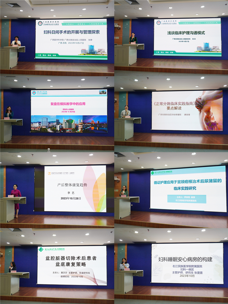 开班仪式结束后,培训班先后邀请了来自广西壮族自治区人民医院妇产科护士长张静、妇产科副护士长陈琼,广西壮族自治区妇幼保健院妇产科护士长兼厢竹产房护士长唐丽春,百色市妇幼保健院龙船院区负责人兼护理部主任李艺,百色市人民医院护理部副主任覃丽锦,右医附院大外科护士长罗琳雪,右医附院妇科二病区黄莎莎、黎丽莎、张萍,妇科一病区罗丽民、张夏露,右医附院总院区产科护士长陈丽芬,右医附院百东院区妇产科朱小英、何晓婷等14名区内专家,分别作了《妇科日间手术的开展与管理探索》、《浅谈临床护理沟通模式》、《正常分娩临床实践指南解读》、《盆底整体康复趋势》、《复盘在模拟教学中的应用》、《循证护理应用于宫颈癌根治术后尿潴留的临床实践研究》、《盆腔脏器切除术后患者的盆底康复策略》、《调查性研究从何入手》、《腕踝针技术在妇科疼痛患者中的应用》、《6S管理在妇科管理中的应用》、《妇科睡眠安心病房的构建》、《产后快速康复策略》、《会阴损伤系统化管理的临床实践》、《护理科研文献检索》的专题培训。培训期间,右医附院总院区产科护士长陈丽芬、百东院区妇产科护士长朱小英还分别应邀为培训班作了正常分娩接产技能工作坊的助产、接产技能指导演示,通过情景再现演示规范的助产接产过程。