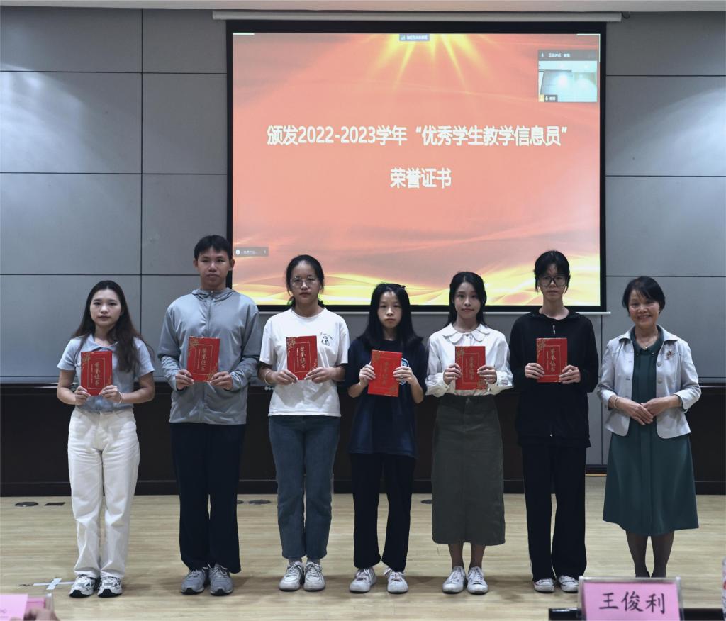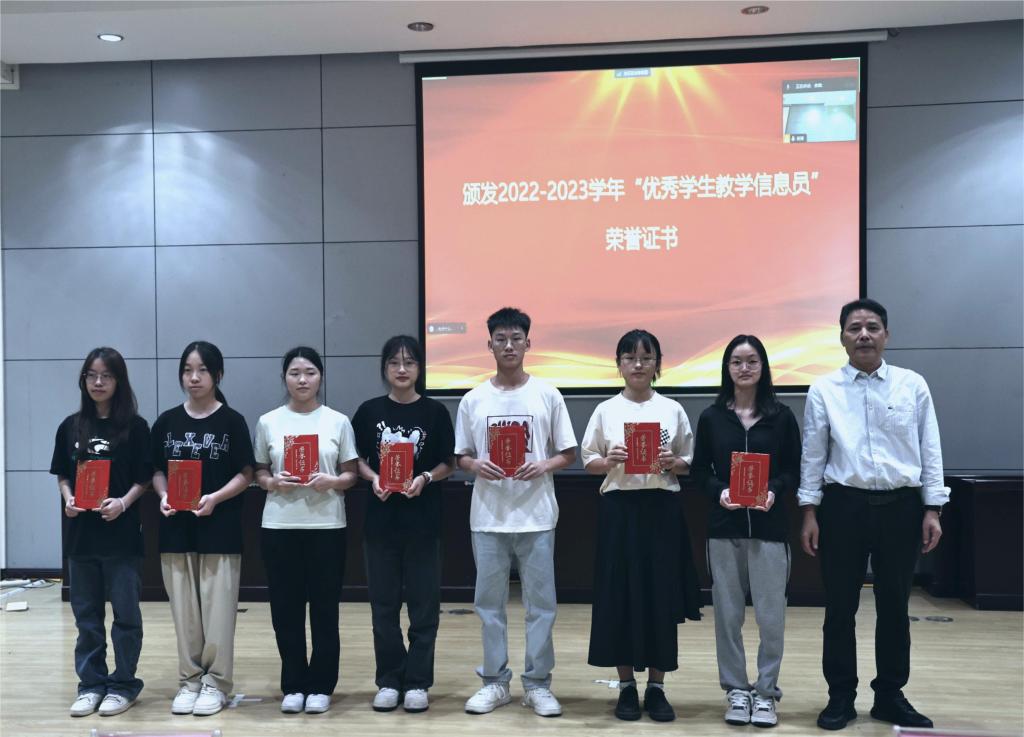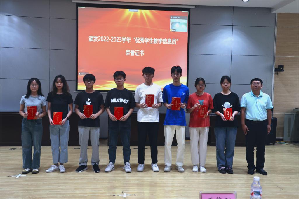 会议首先对2022-2023学年优秀学生教学信息员代表进行表彰,王俊利副校长、姚金光总督学及黄秀峰主任分别给优秀学生教学信息员代表颁发了荣誉证书并合影留念;接着由王俊利副校长宣读2023-2024学年学生教学信息员的聘用文件,姚金光总督学为新一届学生教学信息员代表颁发聘书。