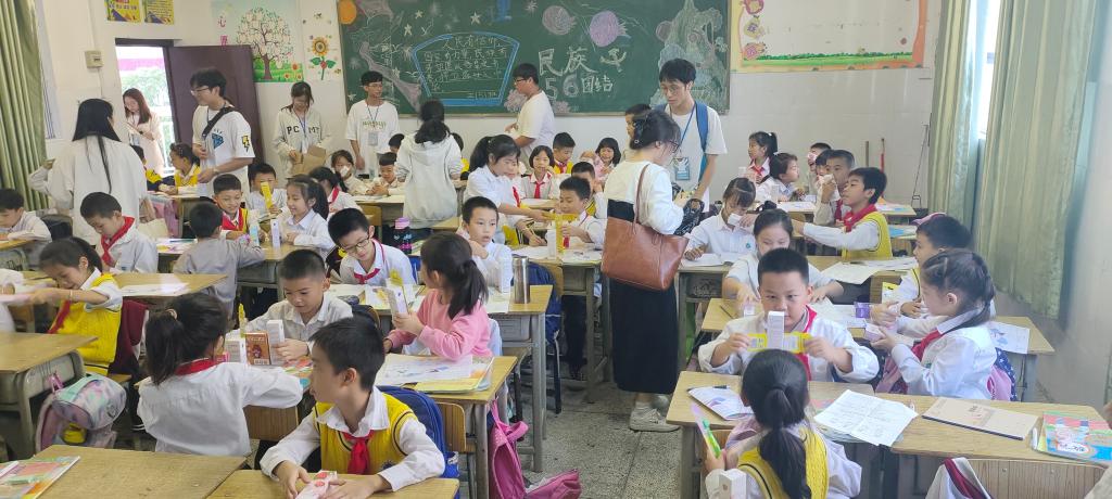 活动期间,志愿者向孩子们介绍了活动的目的和意义,拉近彼此距离,同时发放关于窝沟封闭和口腔健康知识的调查问卷,并现场讲解。随后,大学生志愿者韦璎芳同学带领孩子们开始学习儿童口腔保健知识,包括牙齿的清洁保护以及窝沟封闭的重要性。讲解过程中,她与孩子们互动提问,鼓励大家主动学习口腔保健知识。同时播放相关视频,帮助他们更好地掌握口腔保健知识以及培养良好的口腔卫生习惯。课堂结束后,志愿者们耐心解答孩子们提出的问题,并向孩子们发放了口腔健康宣传册与牙膏牙刷等纪念品。