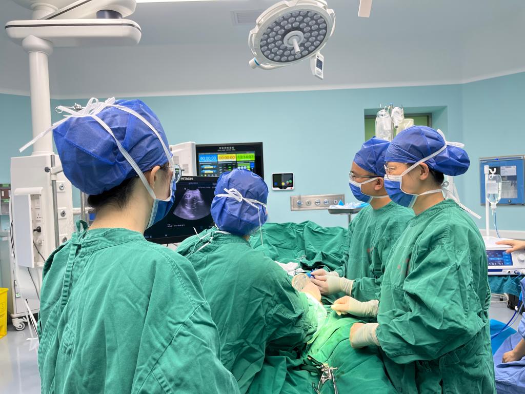 2023年11月14日,我院妇科二病区主任梁月秀带领团队,在麻醉科覃福兴医师、超声科专家利青及麻海智医师的协作下,在全身麻醉下为患者成功施行了超声引导下人工腹水+超声引导下宫颈病灶微波消融术+宫颈病灶穿刺活检术+宫颈病灶穿刺注射聚桂醇硬化治疗。术中,我院妇科二病区梁月秀主任团队运用娴熟的操作技术,在超声引导下合理选择手术入路,将微波消融针直接穿刺到病变部位,对患者病灶进行了多点位消融灭活,由消融针释放的热磁场可以使周围的分子高速旋转运动并摩擦升温,从而使消融区组织发生不可逆凝固性坏死,使病灶缩小或逐渐消失,达到治疗的目的。消融后,梁月秀主任团队再次用超声造影即刻评估消融灶无血供区达到预期,准确迅速地完成了此例次全子宫切除术后宫颈病灶微波消融术。