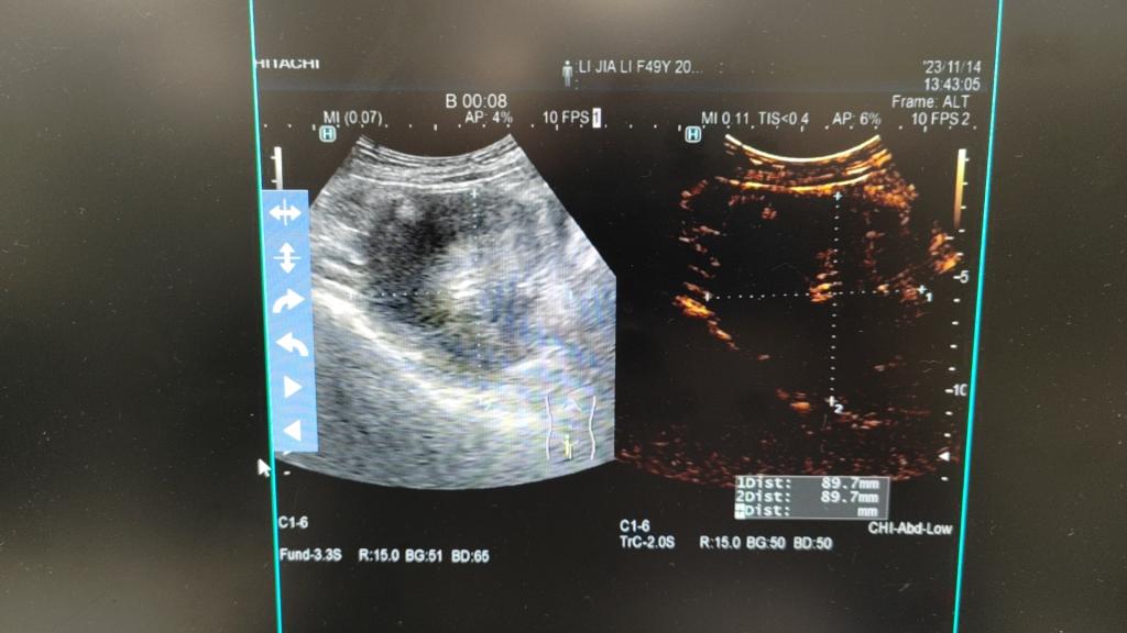 消融后,我院妇科二病区梁月秀主任团队再次用超声造影即刻评估消融灶无血供区达到预期,准确迅速地完成此例次全子宫切除术后宫颈病灶微波消融术