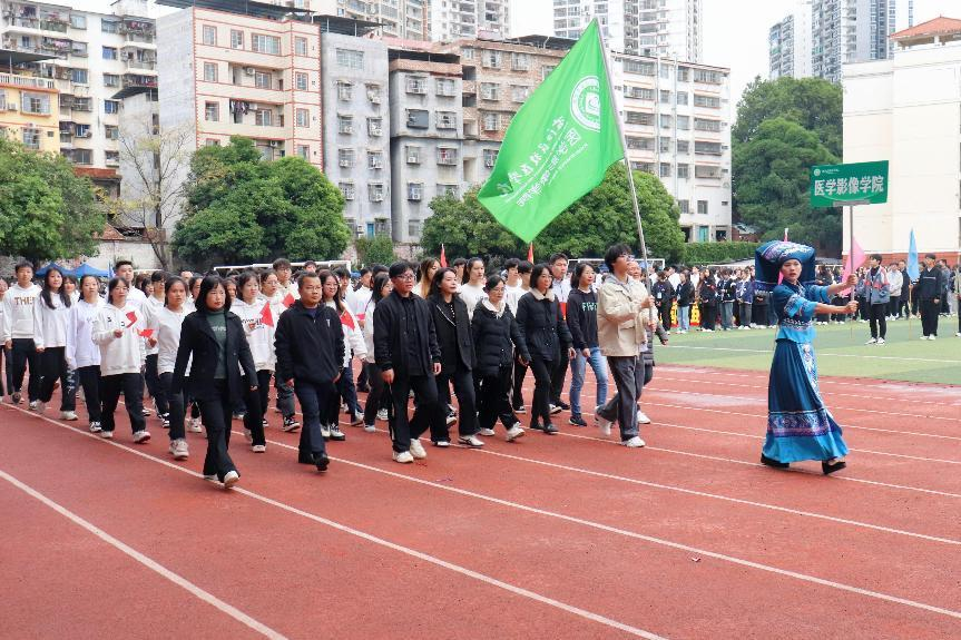 体育如花绽放快乐校园,青春似火点燃亮丽人生。医学影像学院党委书记李丹希望影像运动员们能够发挥自己全部的实力,赛出最好的成绩,为自己争光,为学院争光。提及本次开幕式的特别之处,她指出,本次校运会开幕式,医学影像学院高举“三红”育人的口号,体现出学院精神风貌,营造了学院向党跟党走的良好氛围。