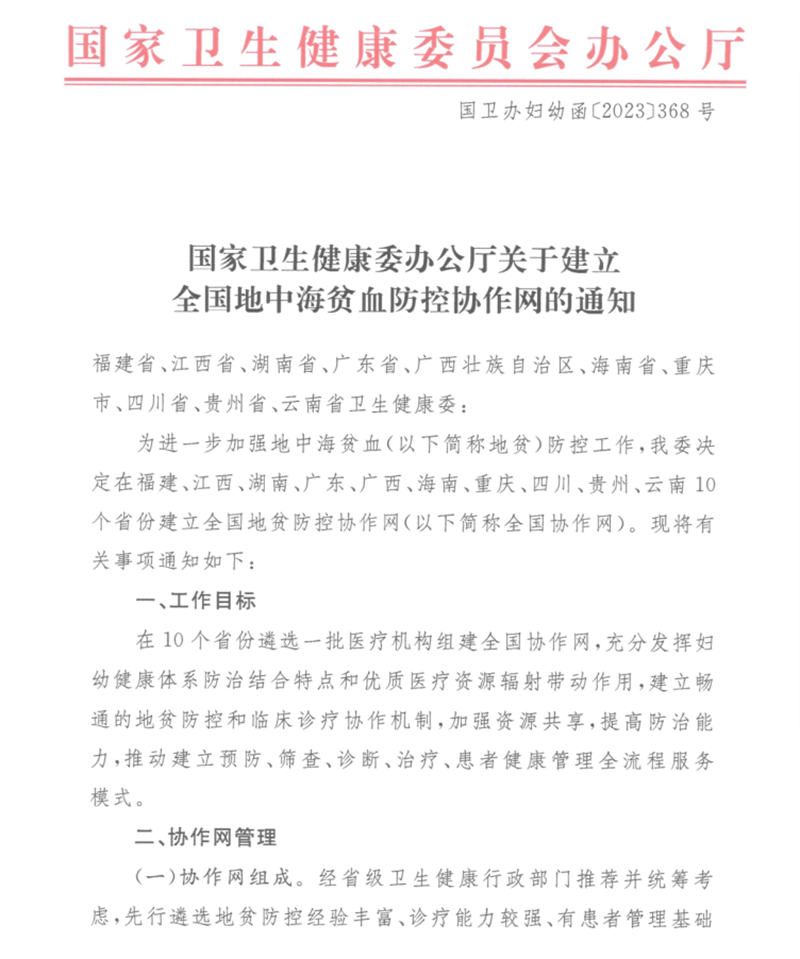 据悉,地中海贫血(以下简称“地贫”)是最常见的单基因遗传病,为进一步加强地贫防控工作,国家卫生健康委在全国10个省(自治区、直辖市)先行遴选了地贫防控经验丰富、诊疗能力较强、有患者管理基础的101家医疗机构作为协作网单位,遴选了具有专科优势的医疗机构分别作为国家级牵头单位和省(自治区、直辖市)级牵头单位、成员单位,从而组建全国地贫防控协作网。以此为基础,完善与各级妇幼保健机构、基层医疗卫生机构的沟通衔接机制,强化地贫预防控制、诊断治疗、成果推广等全流程管理,为推动我国地中海贫血诊疗保障工作提供有力的支撑。