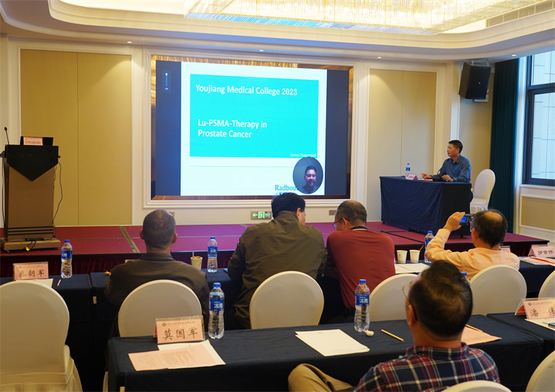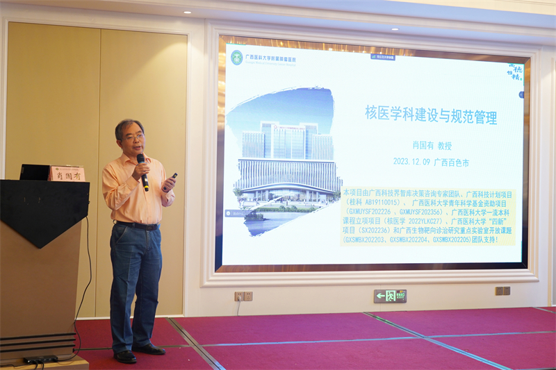 广西医科大学附属肿瘤医院影像中心副主任、核医学科主任、核医学教研室主任肖国有教授作《核医学科建设与规范管理》专题讲座