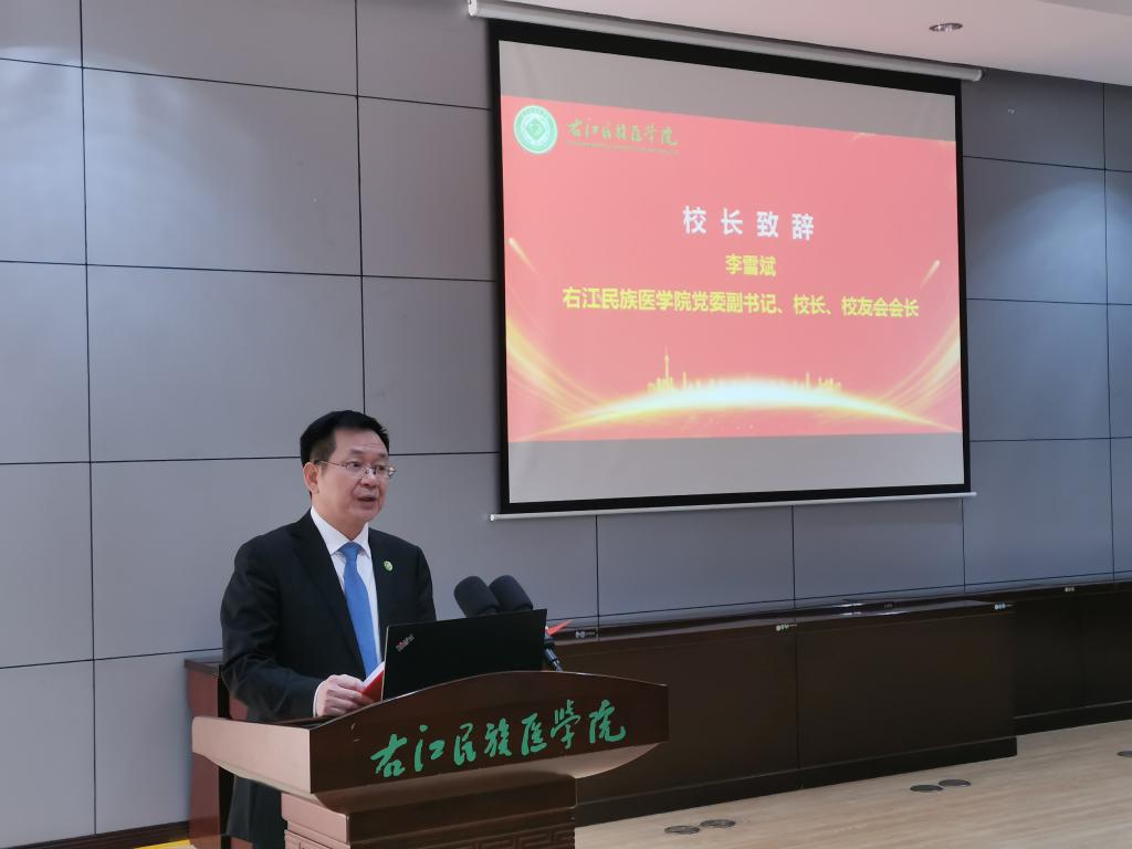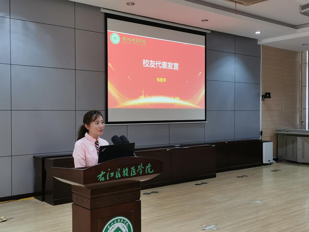 2003级药专2班的校友代表韦思宇在会上发言。她表示,无论身居何处,身居何职,都要铭记学院与母校的恩情,牵挂学院与母校的发展,始终谨记“大医精诚”的校训,在各自的工作岗位上默默耕耘,为祖国的医药卫生事业,为健康中国建设贡献自己的青春力量。