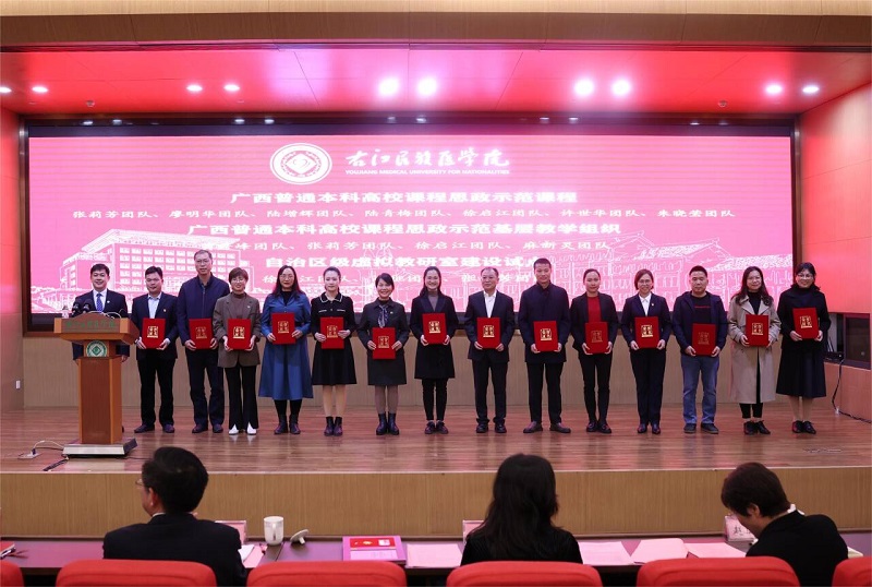 学校党委常委、副校长黄龙坚副校长为广西普通本科高校课程思政示范基层教学组织、思政示范课团队、自治区级虚拟教研室获奖代表颁奖