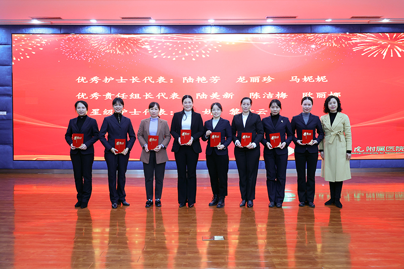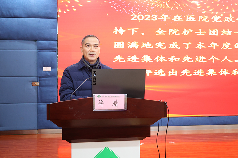 临床医学院(附属医院)韦忠恒院长最后在总结讲话中强调,全院护理人员在2023年不分昼夜、不辞劳苦,始终以饱满的状态,在平凡的岗位上继承和发扬南丁格尔“不畏艰险、甘于奉献、救死扶伤、勇于献身”的人道主义精神,践行着“根植老区为人民,医者患者一家人”理念,医院护理事业在护理质量、服务态度、专业技能等各方面都取得了长足进步,赢得了同行和社会的广泛赞誉。韦忠恒院长表示,医院目前正处于“一院两区”高质量发展的起步阶段,也是规模扩张与质量提升并存的关键时期,希望全院护理工作者首先要提高政治站位,树立忧患意识,结合2024年任务目标,围绕学校第八次党代会的会议精神,进一步加强护理专科的建设,打造桂西一流、省内有重要影响力的“医教研协同发展型”学科。其次要继续探索“一院两区”同质化管理模式,创建科室品牌、医院品牌,稳步推进“互联网+护理服务”工作,深入推进优质护理服务 ,提高患者满意度,提高医院的社会效益。最后要重视DRG付费改革工作,积极响应国家政策,高质量推进三级医院等级复审工作,加快迈出“六位一体”协同发展的“一院多区”医疗集团新征程的步伐,为实现医院“一院多区”跨越式发展以及学校早日建成区域性高水平医科大学而努力奋斗。