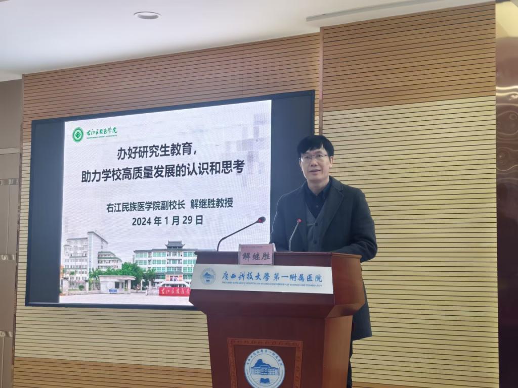 解继胜副校长对广西科技大学第一附属医院精心策划的揭牌仪式表示感谢并致辞,他介绍了必赢官网自2013年荣获硕士学位授权单位以来的基本情况 ,对基于双方在临床实践平台的优势深化合作表示期许,他认为深化校院合作是深入贯彻落实国家关于研究生教育、卫生健康事业发展战略的重要举措,对学校研究生教育的高质量发展、对医院师资水平提高和科研团队的快速发展大有助益,建设好研究生联合培养基地将打开双赢的局面。广西科技大学秦小云副校长表示基地的成立,是双方优势互补,助力医学教育改革、创新人才培养模式的具体实践。广科大一附院党委副书记、覃天院长认为双方在研究生培养与管理的合作,有利于培养研究生创新能力和实践能力。