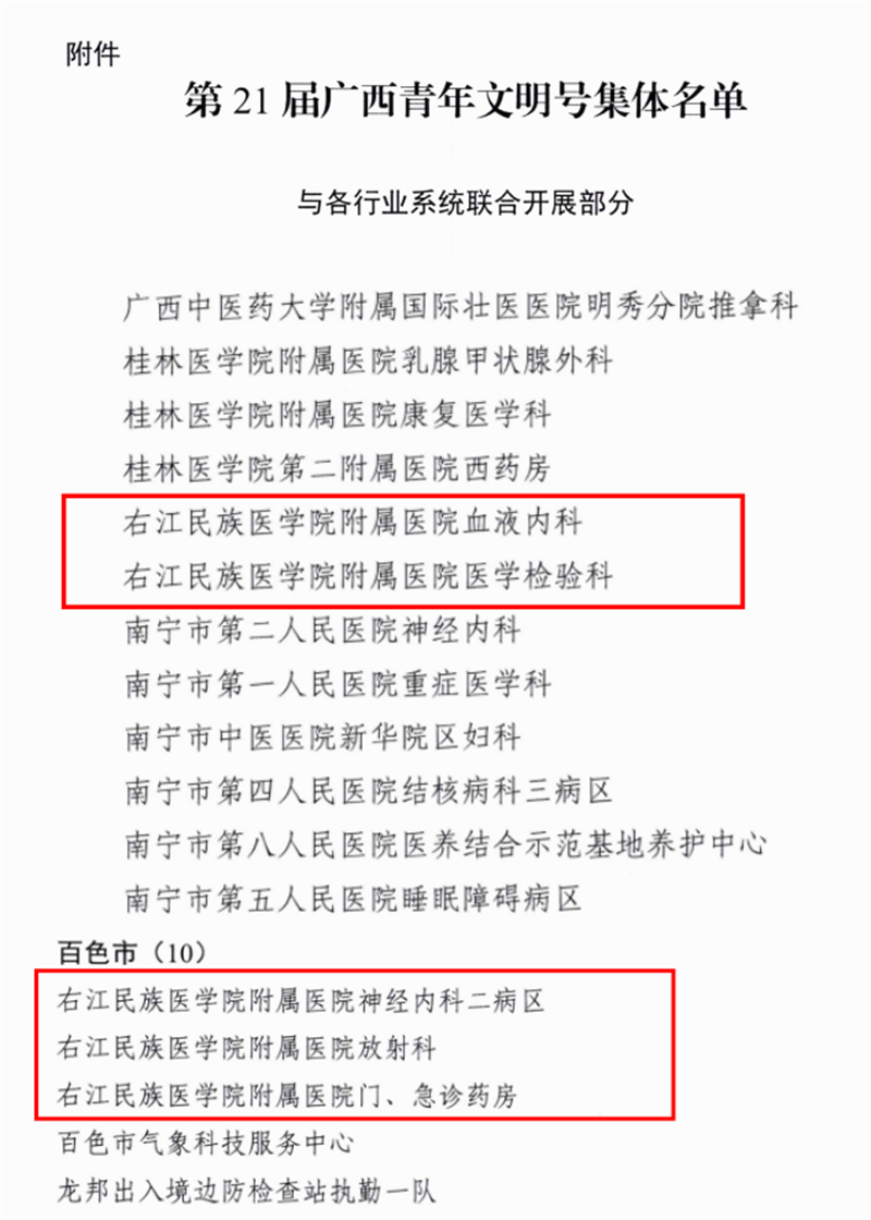 近日,中国共产主义青年团广西壮族自治区委员会发布《关于命名第21届广西青年文明号并进行星级认定的决定》,其中我院血液内科、医学检验科、神经内科二病区、放射科、门急诊药房等5个青年集体被评为“第21届广西青年文明号”并认定为“一星级广西青年文明号”,充分展现出新时代我院青年的精神文明风采。