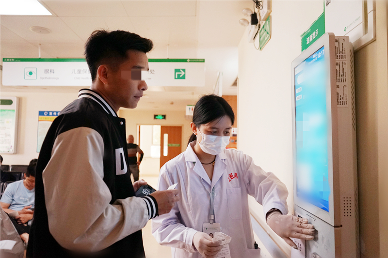 右医附院志愿者帮助就诊人员挂号、打印报告结果