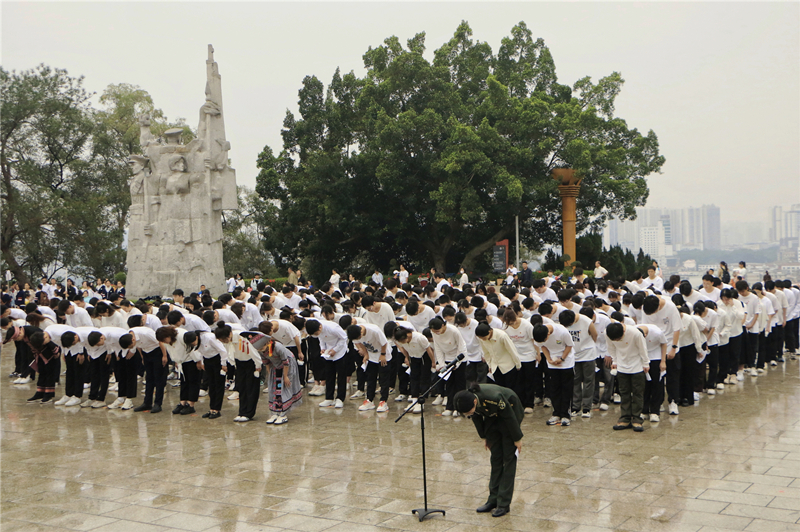 上午9时,全体成员出发步行到达百色起义纪念碑。在主持人的开场引导下,此次清明祭扫活动正式开始。全体成员排着整齐方阵,饱含崇敬之情,肃立在百色起义纪念碑前,向长眠在这片土地的革命先烈默哀并行三鞠躬礼。