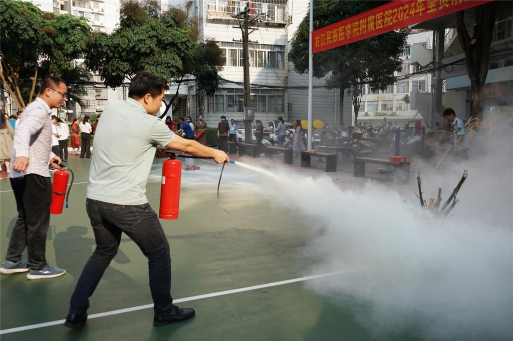 最后,韦忠恒院长宣布右医附院总院区行政后勤科室消防应急演练正式开始。现场模拟演练在发生火情后,各级部门组织开展消防应急疏散逃生系列环节:第一时间拨打报警电话,同时立即启动消防应急预案,安全疏散群众,做好安全防护,有序从最近的安全出口逃离等。演练结束后,与会人员还现场练习使用灭火器、消火栓及水枪进行灭火,进一步将消防安全知识运用于实践。(文图/李秀悦 编辑/隆文斌 二审/刘东亮 三审/王东栋)