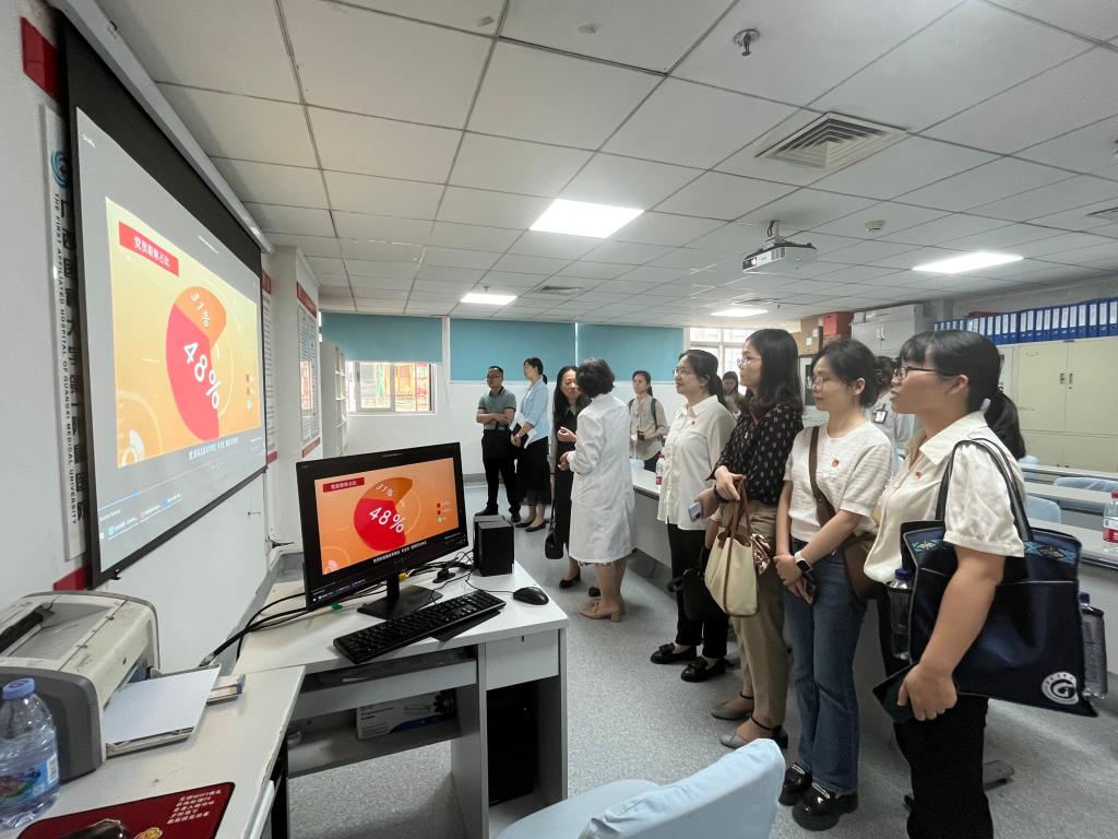 交流研讨会后,与会人员到广西医科大学第一附属医院全科医学科党支部和呼吸与危重症医学科党支部党员活动室观摩党建工作成效。