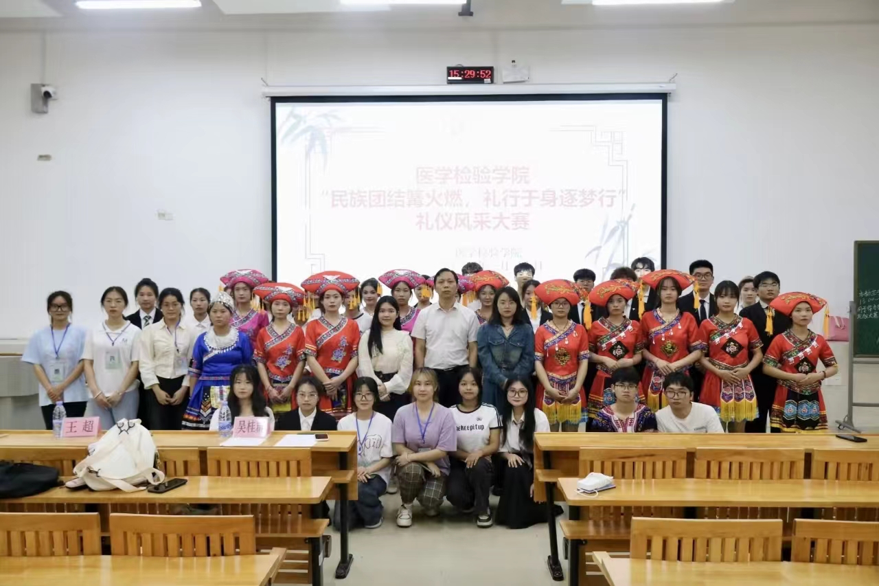 3月30日,医学检验学院在百东校区守正楼c107教室举办了主题为“民族团结篝火燃,礼行于身筑梦行”的礼仪大赛。学院学生科王超老师、王菲老师和吴桂群老师应邀作为评委,学院各班级学生代表参加本次大赛。