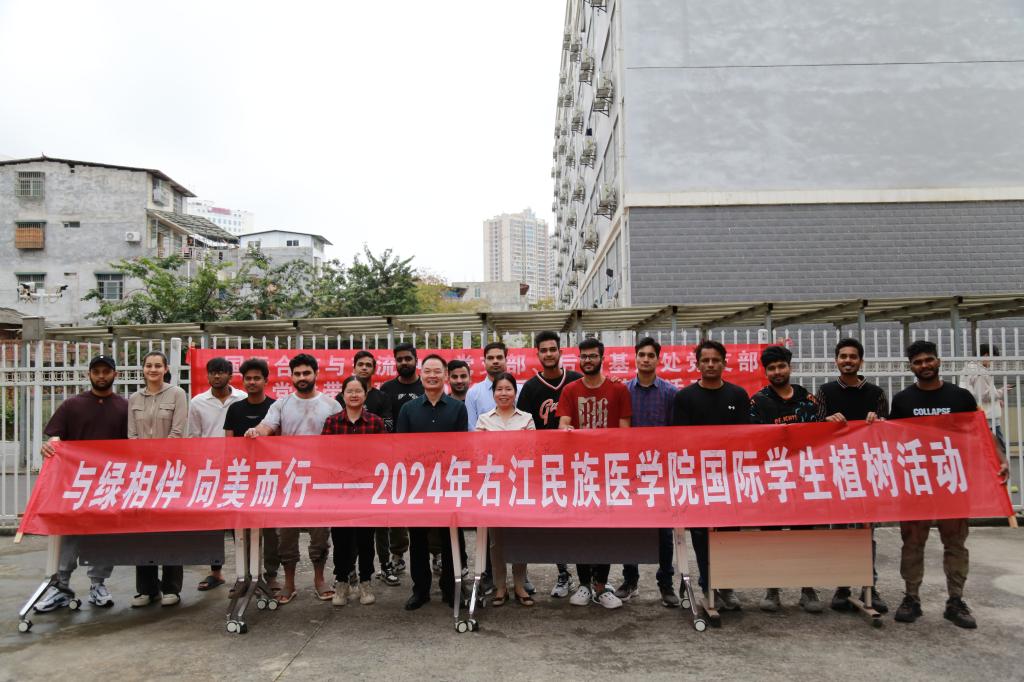 2024年4月7日,为了增强师生的环保意识和生态意识,为学校增添绿色,美化校园环境,国际合作与交流中心党支部、后勤基建处党支部共同在国际学生公寓楼开展“与绿相伴 向美而行”党建带团建主题党日植树活动。参加本次活动的有后勤基建处党支部书记黄敬文、国际合作与交流中心副主任王露瑶、国交中心党支部和后勤基建党支部的老师和即将下点实习的2019级留学生。