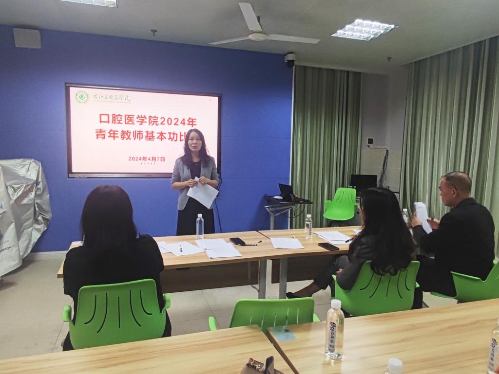 为提高青年教师教学能力和业务水平,强化青年教师队伍建设,4月7日晚,口腔医学院举办2024年青年教师基本功大赛,本次基本功大赛由校级教学督导专家邓敏教授、口腔医学院党委书记廖明华教授、院长黎淑芳教授、口腔颌面外科学教研室主任李俊教授担任评委,多名教师到场观摩。