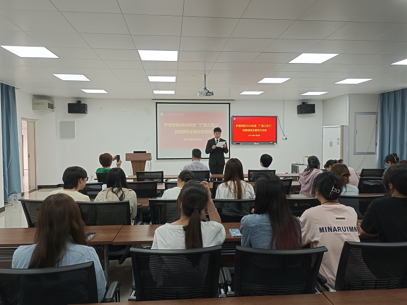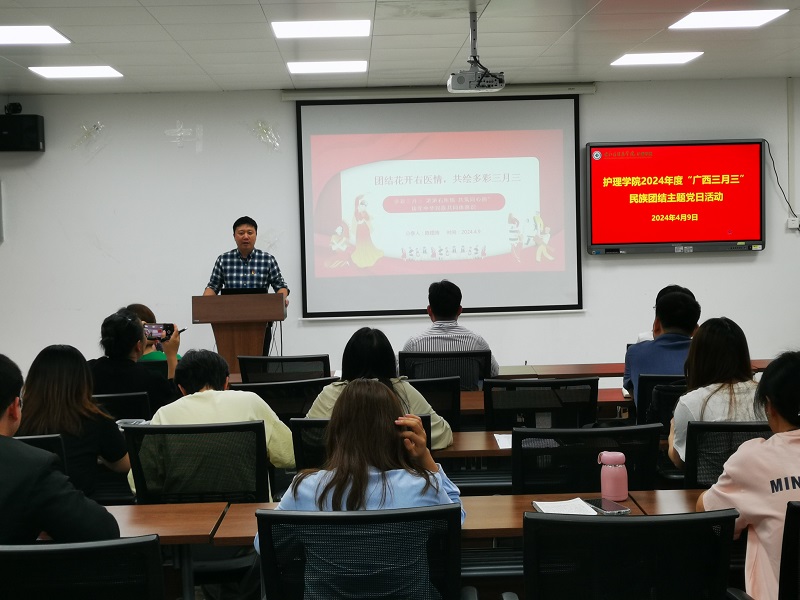 为进一步推动中华优秀传统文化传承发展,进一步巩固全体师生铸牢中华民族共同体意识,护理学院在二楼多媒体教室开展以“民族团结我同行 各族师生一家亲”为主题的“广西三月三”“六个一”民族团结主题党日活动。护理学院教职员工代表及学生代表参加活动。