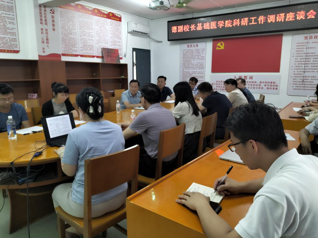 419下午,学校党委常委、副校长谭盛葵科技处处长黄忠仕的陪同下到基础医学院开展科研工作调研,基础医学院党委书记宾晓芸,院长黄衍强,基础医学二级学科、学术带头人参加了调研座谈会