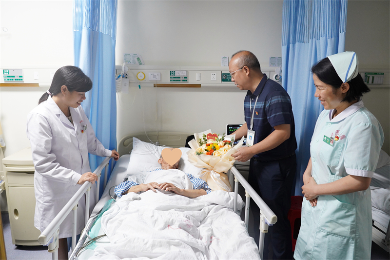 这一次,黄爷爷因“反复胸闷、呼吸困难4月余”入住右医附院总院区心血管内科二病区。在他住院期间,右医附院总院区心血管内科重症监护病房主任刘燕博士、肖鑫护士长带领医护团队针对老人高龄、多种慢性疾病的情况制定了详细的康复治疗方案,从日常关怀、陪伴聊天、一日三餐等细微环节入手,认真做好老人的诊疗和护理工作。经过十多天的精心治疗,老人精神状态明显改善。右医附院医护人员对于抗战老兵的爱心与关爱赢得了老兵及亲属的高度评价。2024年4月19日下午,右医附院党委陈文成副书记来到总院区心血管内科二病区看望黄爷爷,并代表医院向老人送去鲜花和慰问品,传递医院浓浓温情。在病房里,陈文成副书记与心血管内科医护人员、黄爷爷及其家属悉心交流,详细询问病情及治疗方案,深入了解黄爷爷的抗战经历,并表示崇高的敬意和亲切的慰问。