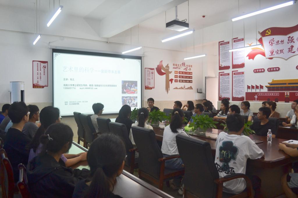 牧之教授结合艺术学与医学的紧密关系,开展题为“艺术里的科学——创新带来的发展”的医学人文素质教育专题讲座。牧教授以自身早年坎坷的经历鼓励同学们珍惜当前的教育资源,争做社会有志青年。接着,牧教授介绍了海南省黎锦、黎陶等非物质文化遗产,就这些非物质文化遗产的起源、传承以及如何通过科技促进发展实现产业化发展进行详细解说。进而牧教授结合艺术学与医学的紧密联系,阐释了艺术学与医学的融合点。他指出,艺术学界有众多学者在人体解剖学中有深厚的研究造诣,例如达芬奇的人体解剖素描技术在人体绘画中的精确度大力推进了医学发展,他鼓励同学们在学习和工作中要以兴趣爱好为出发点,将兴趣与职业有效融合,并思考如何在学习和职业中通过创新寻找更高的发展可能并取得更高的成就。