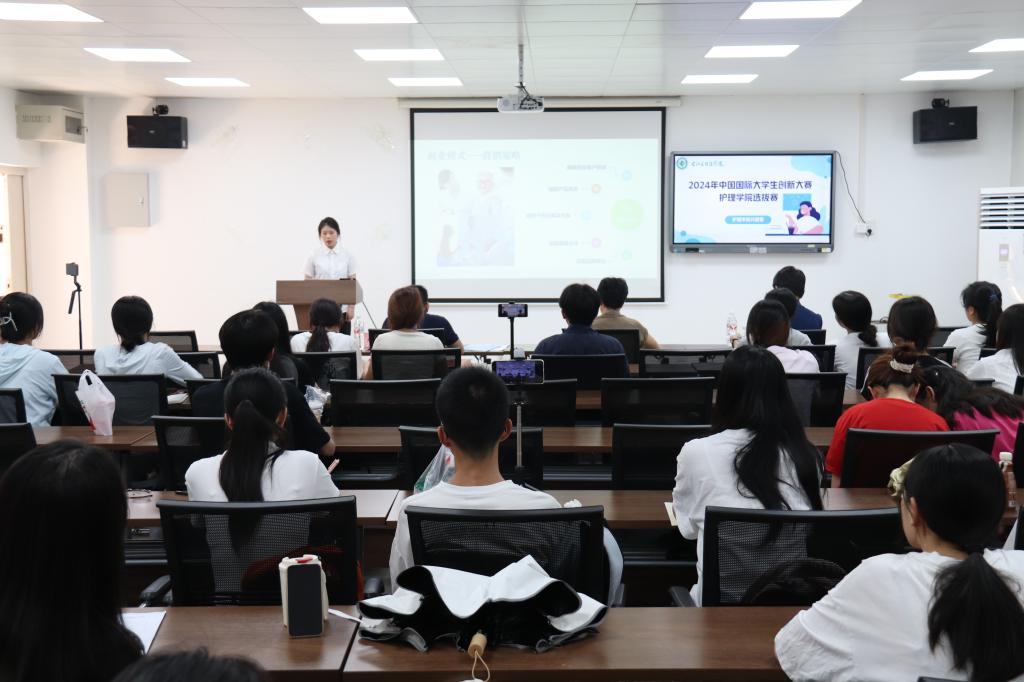 为激发护理专业大学生的创新思维和实践能力。2024年4月27日,护理学院于百城校区8-211会议室开展2024年中国国际大学生创新大赛护理学院选拔赛路演,护理学院院长张莉芳、学校教务处副处长郑学森以及公共卫生与管理学院大学生创新创业教研室主任陆增辉作为评委老师出席本次路演比赛。