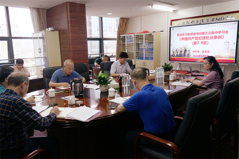 2024年5月9日上午,右医附院在总院区门诊五楼会议室召开党纪学习教育读书班第三次集中学习研讨会。院党委林栩书记主持学习会,院党委陈文成副书记领学《中国共产党纪律处分条例》第七至九章的内容,医院党政领导班子成员参加集体学习。