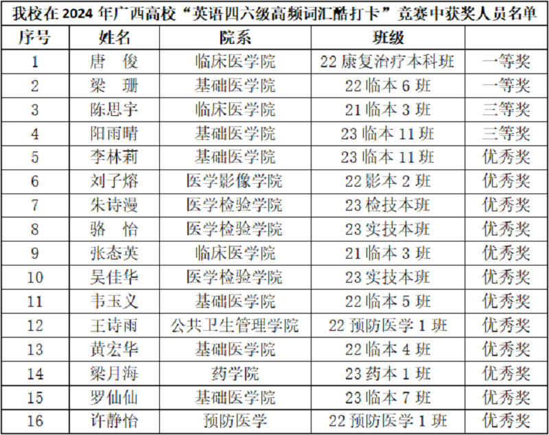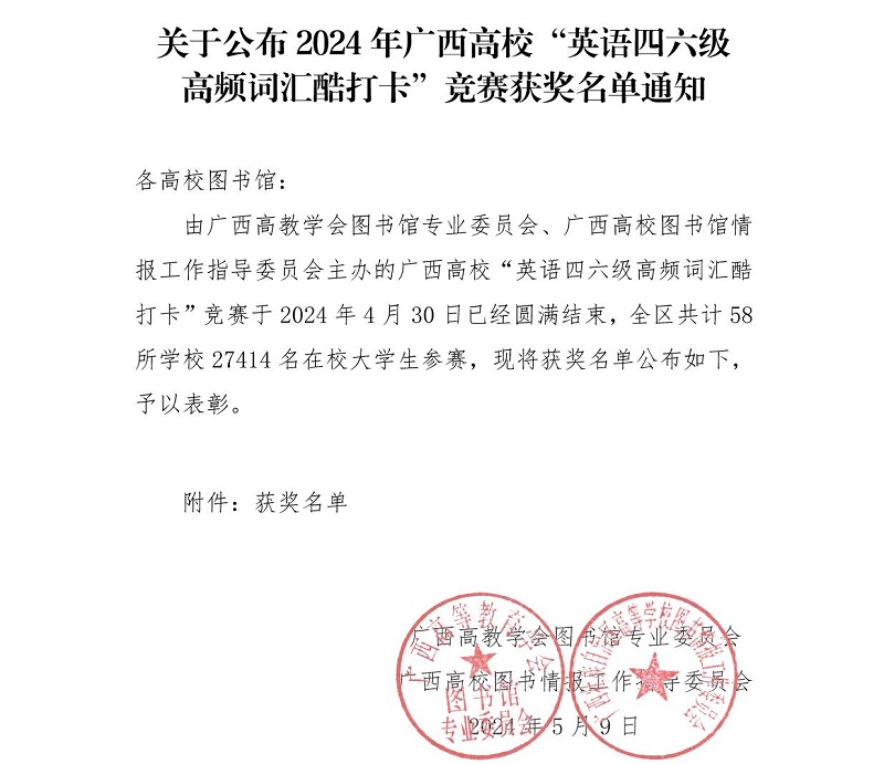 由广西高教学会图书馆专业委员会、广西高校图书馆情报工作指导委员会主办的高校“英语四六级 高频词汇酷打卡”竞赛已于4月30日圆满结束。本次比赛旨在帮助大学生养成持之以恒的良好学习习惯,提升大学生英语学习兴趣。