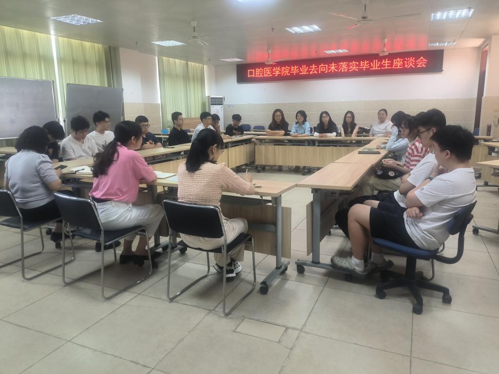 参与此次座谈会的有口腔医学院党委书记廖明华、党委副书记黄春苗、学生科科长陶肖云以及2024届毕业去向未落实的毕业生。座谈会上,同学们围绕就业签约单位、规培、考研等方面的就业意向及规划进行分享汇报,对现阶段就业意向落实中存在的困难进行积极提问,与会老师逐一对毕业生在就业过程中的困惑做出解答。
