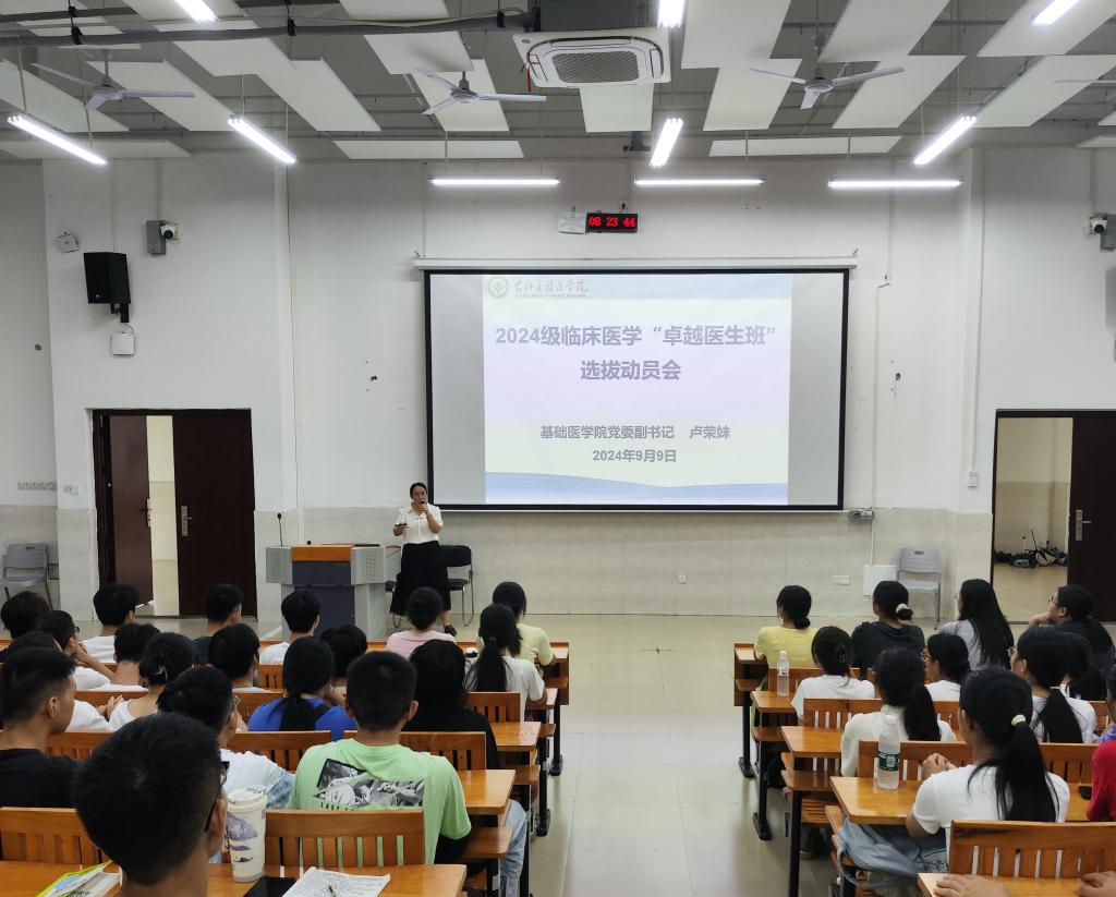 9月9日,必赢官网在百东校区守正楼C-207教室召开2024级临床医学本科专业(卓越医生班)选拔动员大会,2024级临床医学本科专业12个班级共720人分三批次参加了会议。基础医学院党委副书记卢荣妹分别从卓越医生班实施背景、培养定位、实施效果、选拔方式等方面进行介绍,希望同学们勇于挑战自我,积极参加“卓越医生班”选拔面试,利用“卓越医生班”的平台努力学习,勇于担负起学校教改的“使命”,为学校更为自己的人生写下辉煌的篇章。