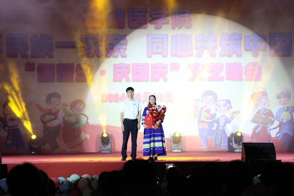 踏时代之浪,焕青春之光。此次文艺晚会的成功举办,不仅璀璨绽放了绚烂多彩的校园文化与师生们横溢的才华,更进一步铸牢中华民族共同体意识。在国庆佳节到来之际,新同学们的加入为校园注入了无限生机与活力,他们与师长们共聚一堂,共襄盛举,共同庆祝祖国的繁荣昌盛。展望未来,这片充满希望与机遇的土地将见证新同学们茁壮成长的每一步,他们定将以饱满的热情、坚定的信念,以医学生的仁心仁术和使命担当,为实现中华民族伟大复兴的中国梦贡献自己的青春力量,共同书写民族团结进步的崭新篇章。