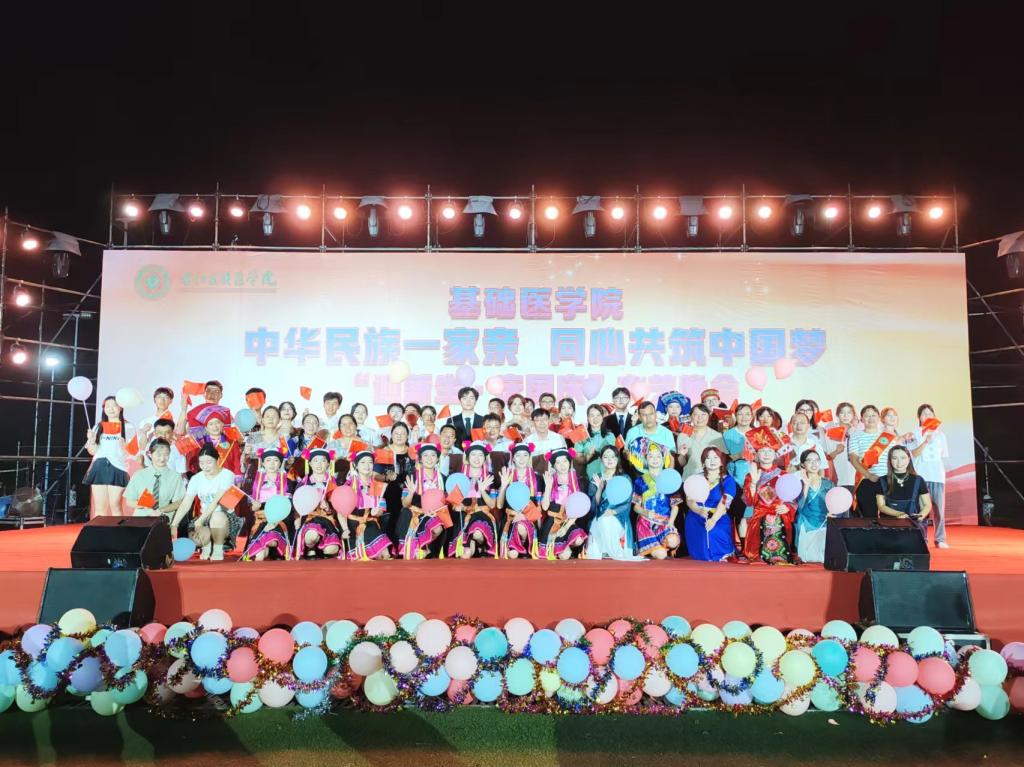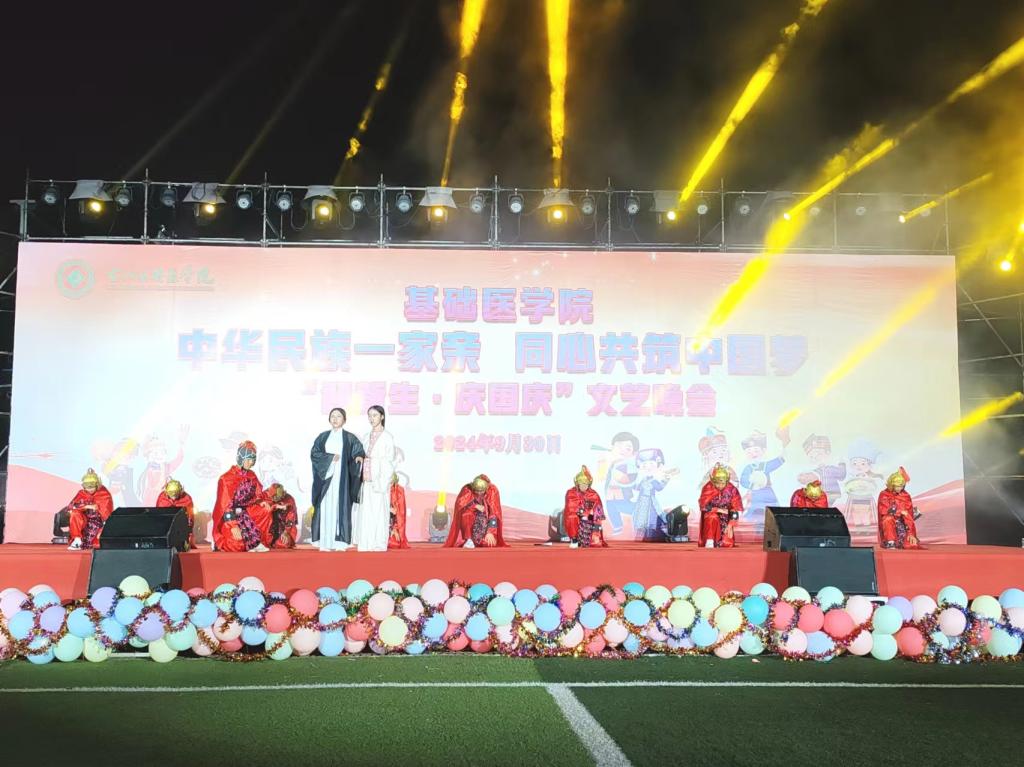 深入贯彻落实习近平总书记关于加强和改进民族工作的重要思想,积极响应习近平总书记在全国民族团结进步表彰大会上的号召促进各民族生交往交流交融,让各民族生如同石榴籽般紧密相连,共同庆祝祖国华诞2024年9月30日晚上,在中华人民共和国成立75周年来临之际,基础医学院在百东校区田径场隆重举行“中华民族一家亲,同心共筑中国梦”民族团结迎新生·庆国庆”文艺晚会学校党委常委、副校长解继胜,党委统战部、党委学生工作部、校团委、各二级学院领导代表及基础医学院全体师生欢聚一堂,共赴这场充满民族风情的盛会