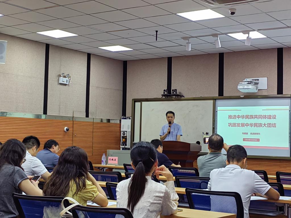 10月9日下午,马克思主义学院党委在百城校区5栋2楼录播室召开“三三三”理论学习会,邀请学校党委常委、统战部部长韦鹏涯开展专题讲座《学习习近平总书记在全国民族团结进步表彰大会上的重要讲话精神》,学院全体党员教师参加会议,会议由党委书记、院长许世华主持。