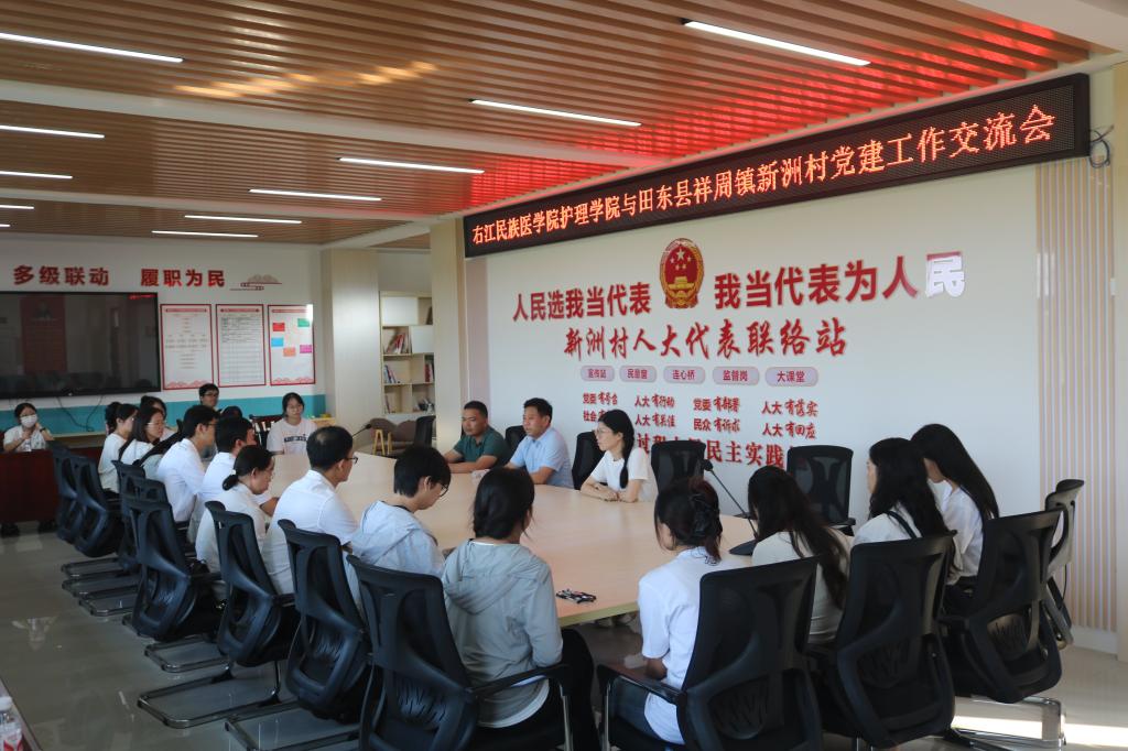 活动中,师生党员们还前往田东县祥周镇新洲村党群服务中心,与新洲村干部开展党建工作座谈交流,双方就村级党支部建设人才引育、推动乡村振兴方面进行深入交流。通过交流,师生党员们切实感受了乡村振兴工作一线的工作队员和农村两委干部的日常工作,学习他们深入群众、为群众办实事的精神。