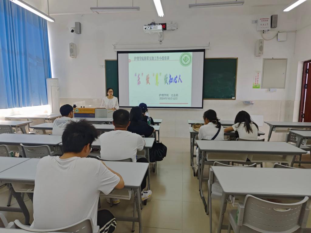 为了进一步强化大学生心理健康互助意识,提高朋辈心理互助能力,促进大学新生具备良好的心理素质,10月12日,护理学院在百东校区守正楼C-102教室举办了以“乐”做“慧”做知心人为主题的朋辈互助工作小组培训活动。活动由护理学院学生科文志娟老师主讲,2024级各班心理委员参训。