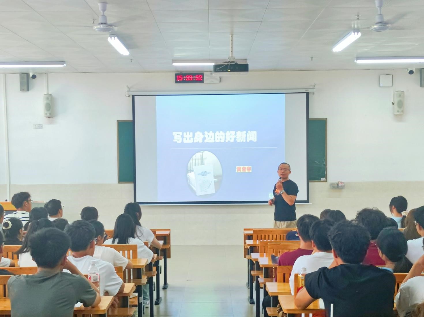 黄宏春老师从当下大学生获取信息的途径现状引出新闻写作话题引入,他鼓励同学们在信息时代应该多阅读报纸、关注时事新闻,以此增强写作能力。黄宏春老师和同学们探讨了新闻和消息的区别,强调新闻报道的基本结构,表示新闻写作要具有价值性、准确性、客观性和时效性。对于摄影技巧,黄宏春老师提出要拍摄有群体性、代表性的照片,他展示了一些拍摄反面实例,例如失衡、场景混乱、角度问题、比例失调等问题案例,以此让同学们更加直观、清晰地了解摄影的常见问题,以及掌握如何去规避这些问题的方法。黄宏春老师还指出,抓拍新闻插图时,应该突出内容主题,也应该注意所拍摄主角的表情、神态。