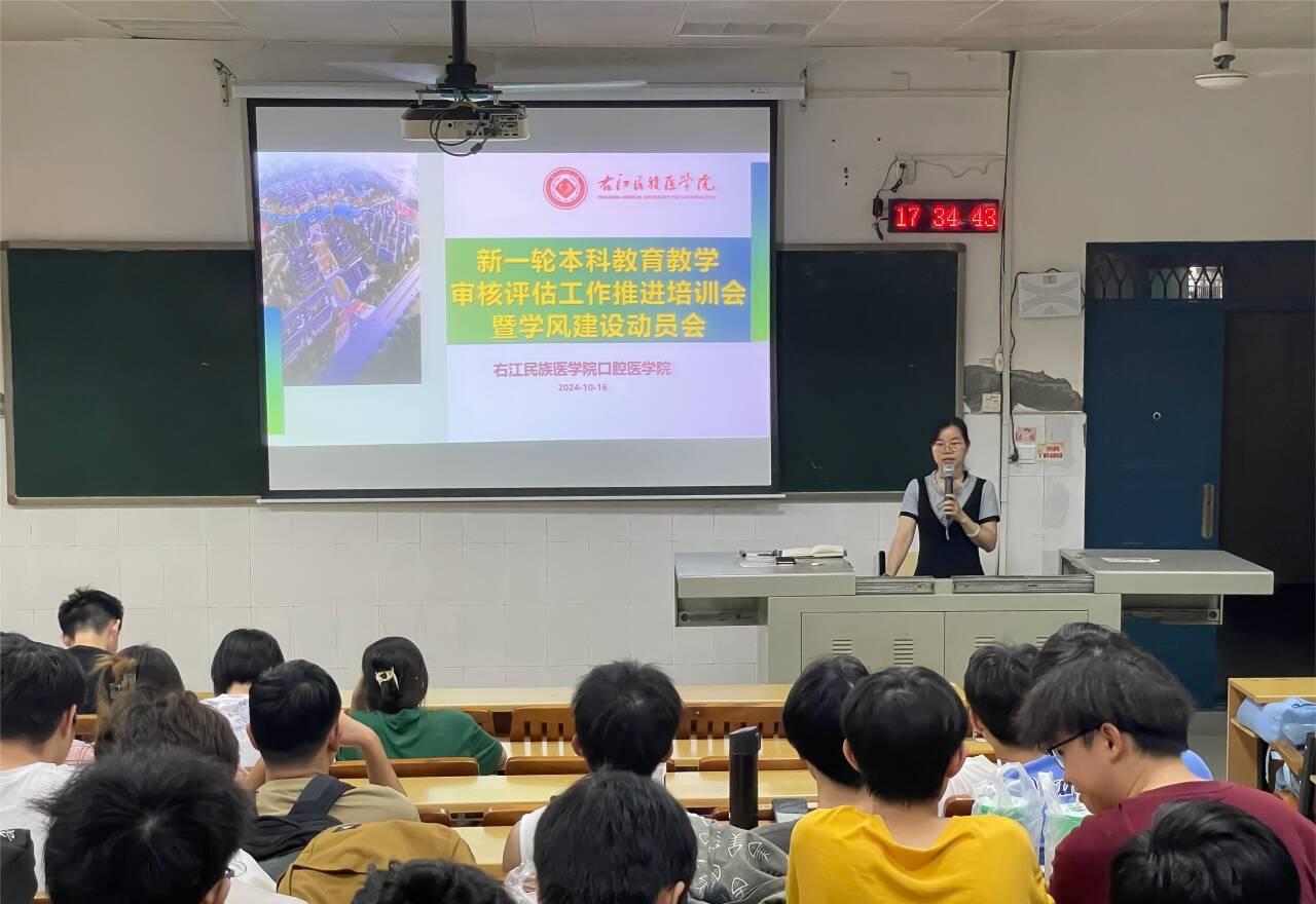 为了营造良好的学风、班风和舍风,以崭新的精神风貌迎接本科教育教学审核评估工作,口腔医学院分别于10月16日和17日,在百城校区和百东校区开展了两场本科教育教学审核评估学生培训会暨学风建设动员会。口腔医学院全体在校生和辅导员、班主任参加了培训,培训由学生科科长陶肖云老师主讲,党委副书记廖赞勇老师做总结讲话。