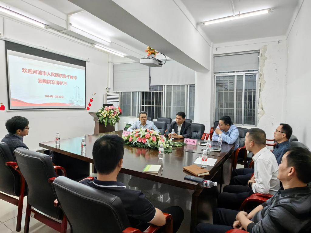 杨尚霖代表学校教务处对河池临床医学院(附属河池医院)外科教研室一行的到来交流学习表示热烈欢迎,希望河池临床医学院持续加强教学基层组织建设,开展好教学集体活动,在提升师资教育教学能力方面不断创新培训方式方法,将OBE理念融入课堂教学,构建好院内教学质量保障体系。