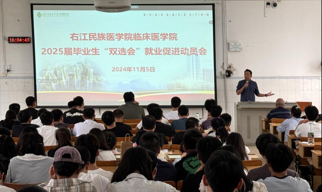 为做好临床医学院2025届毕业生就业工作,引导学生树立正确的就业观,调整就业心态,提高就业主动性、积极性,实现充分就业。11月5日,临床医学院召开2025届毕业生“双选”会就业促进动员会,学院党委陈文成副书记及毕业班辅导员黄勇老师主讲,2025届全体毕业生参会。