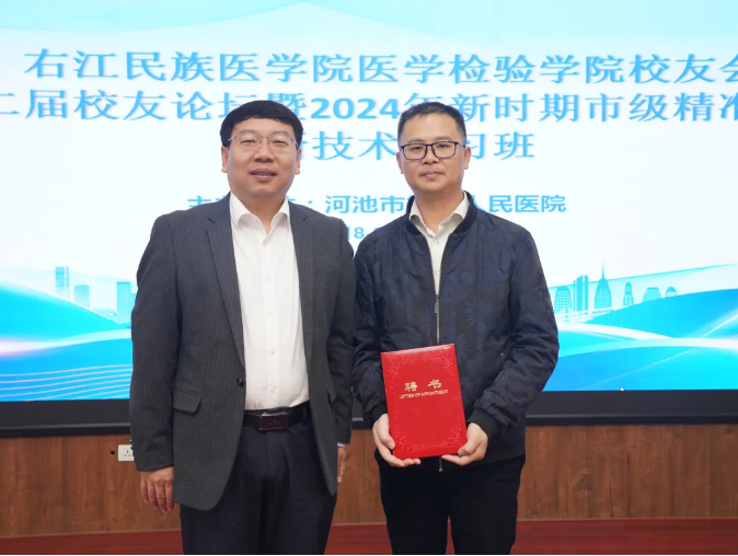 次日,在河池市第一人民医院举行医学检验学院校友会第二届校友论坛暨2024年新时期市级精准检验新技术学习班。本次会议吸引了区内各级医疗机构近200名检验专业人员参与,众多临床检验的专家齐聚一堂,围绕精准检验的前沿医学技术应用等内容展开分享与研讨。