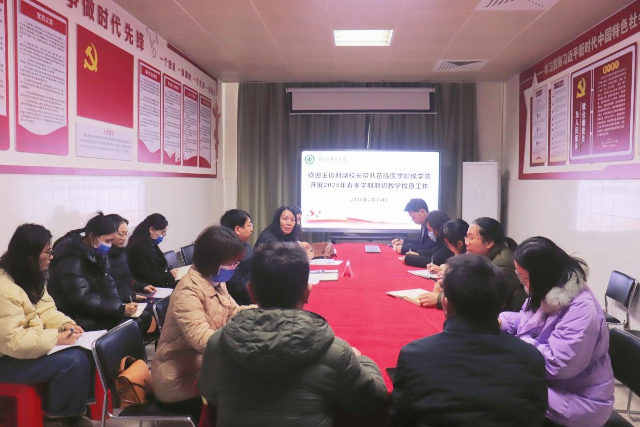 为全面保障新学期教育教学工作平稳运行,营造规范、高效的育人环境,2月24日下午,学校党委常委、副校长王俊利到医学影像学院进行2025年春季学期期初教学工作检查。会议在百城校区6栋607室进行,学院各教研室主任及相关教学管理人员参加会议。会议由蓝常贡副院长主持。