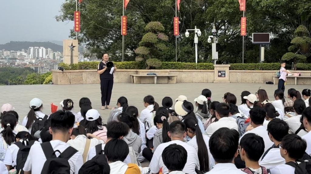 上午10点半左右,百东校区与百城校区师生经过三个半小时的长途跋涉,来到百色起义纪念馆前“胜利会师”。在百色起义纪念馆前,王金花副院长以《传承红色基因 赓续奋斗使命》为题,为师生们讲授了一堂微党课。她从纪念馆陈设进行讲解,引导师生感悟“革命理想高于天”的信仰力量,引导师生汲取“越是艰险越向前”的奋斗动力,要以“123456”等品牌活动为抓手将红色教育融入思政课堂,以“党团共建”为纽带推动产学研协同育人,激发师生的内生动力,从红色基因中凝聚“众人拾柴火焰高”的团结共识,为培养担当民族复兴大任的时代新人接续奋斗。