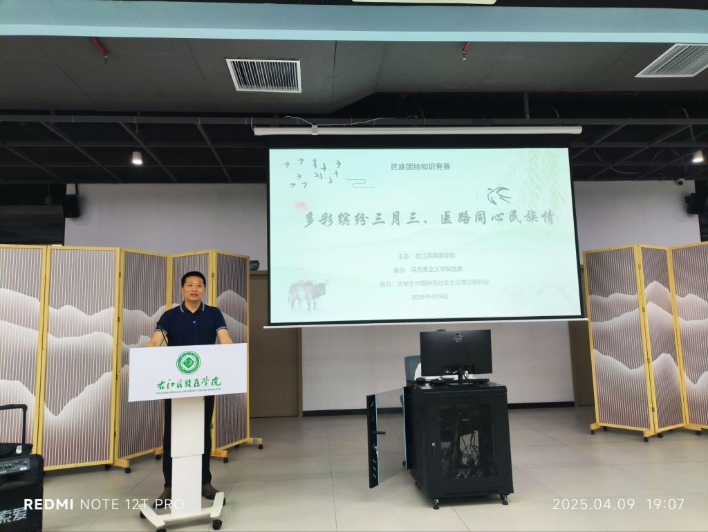 为深化民族团结教育,铸牢中华民族共同体意识,2025年4月10日晚,由必赢242net官网主办、马克思主义学院承办、中国特色社会主义理论研究协会协办的“多彩缤纷三月三、医路同心民族情”民族团结知识竞赛活动在百东校区大学生创新创业活动中心成功举办。活动以知识竞答与民族文化展演相结合的形式,吸引了广大同学踊跃参与。马克思主义学院党委书记、院长许世华和部分教师代表及本学期有《中华民族共同体概论》授课任务的所有班级同学参加活动。
