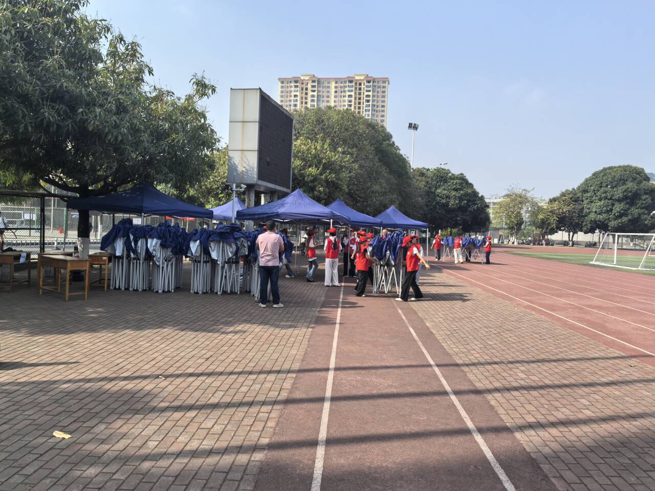 为确保运动会顺利进行,后勤基建处成立“校运会应急保障组”,并制定了详细的方案,确保突发情况能快速响应。比赛前一天,服务保障科工作人员顶着高温搭建了45顶遮阳帐篷、摆放了30余套桌椅,在检录处、观众席、医疗点等关键区域搭建起连绵的“蓝色长廊”,为师生提供临时休息与紧急救护的场所;卫生所储备了充足的医疗用品及防暑降温物资,并针对中暑、扭伤、脱水等常见运动伤害进行专项演练;饮食服务中心还配送了充足的凉茶、糖水、温开水给运动员们提供能量补给。
