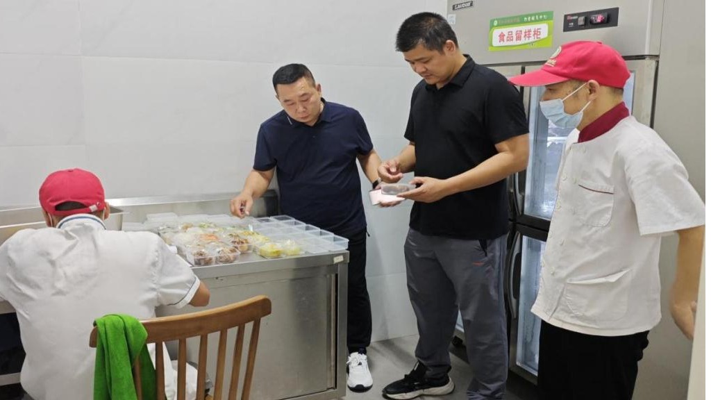 在食品安全检查时,突出全链条溯源理念。严格查验了米面粮油、生鲜肉蛋等食材的生产日期、保质期、进货台账,检查冷藏冷冻设备运行状态,对食品加工流程进行规范核查,查看生熟食品是否严格分区存放、避免交叉污染,现场核查了餐具消毒区与清消记录,确认消毒设备正常运转、消毒流程符合标准,还对当日烹饪菜品的中心温度进行抽查,确保食品烧熟煮透。