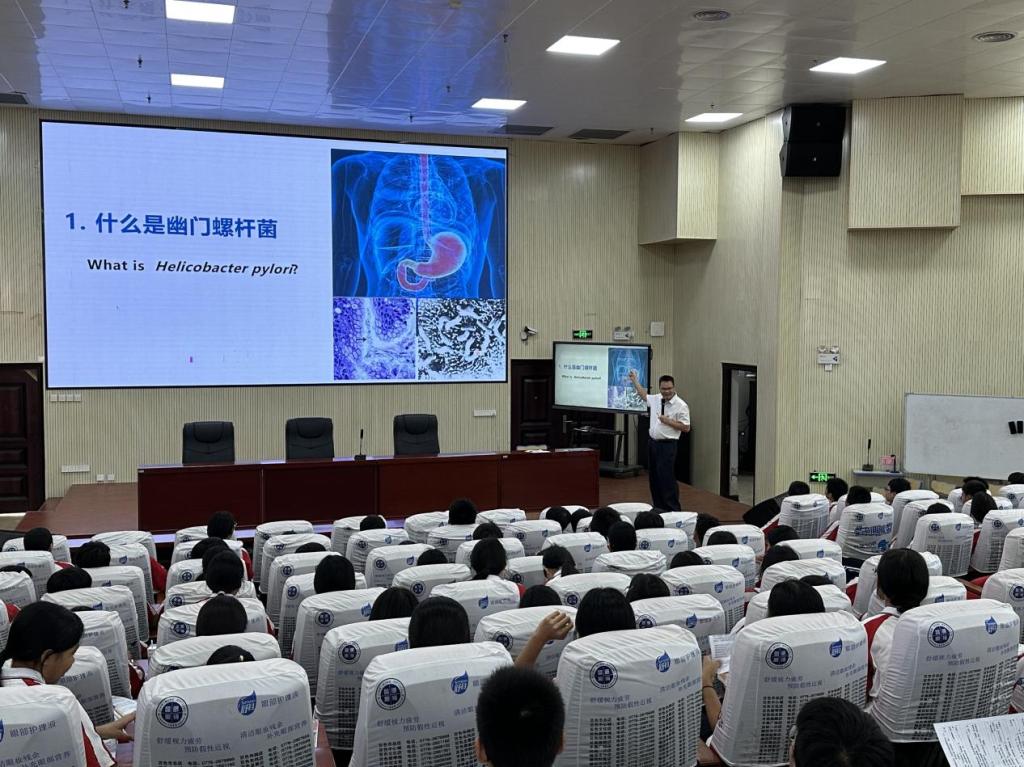 活动中,黄衍强教授结合自身的研究进行了幽门螺杆菌防治知识宣讲,从什么是幽门螺杆菌、幽门螺杆菌是怎么发现的及幽门螺杆菌防治知识开展宣讲,精彩的宣讲激起了现场学生的求知欲。黄教授还介绍了桂无幽科学家精神工作室在幽门螺杆菌防治所做的努力,向同学们展示了优秀的科普案例及作品,让更多学生了解科学,关注医学,掌握常见传染病的防治。