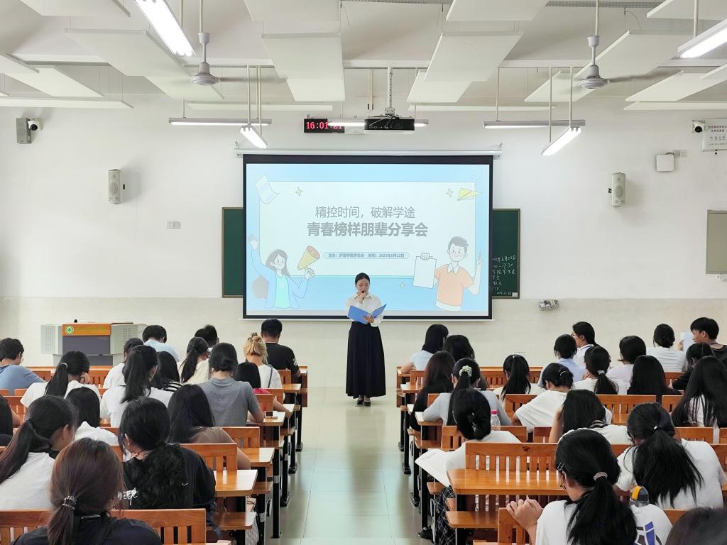 为缓解护理学子学业压力,优化时间管理能力,营造积极向上的学习氛围,6月22日下午,护理学院在百东校区开展了以“精控时间,破解学途”为主题的第二十一期青春榜样朋辈分享会。本次活动邀请优秀学生代表谢雨珊同学为24级本科班同学分享学习经验。
