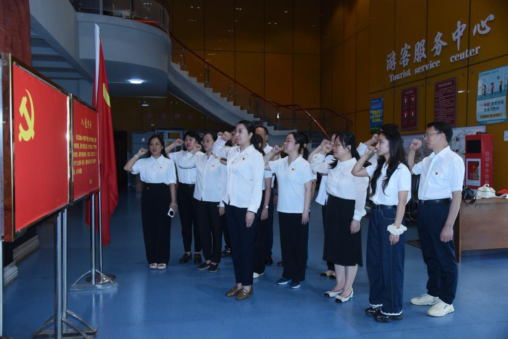 党员和团员青年参观黄文秀先进事迹教育基地,了解其放弃城市条件、投身脱贫攻坚的事迹,被其拼搏精神和为民情怀打动。参观基地结束后,全体人员前往中国红军第七、第八军乐业会师纪念馆,了解老一辈革命家创建红军、开辟根据地的历程,感悟革命先辈的理想信念和牺牲精神。最后,全体党员重温入党誓词,彰显对党的忠诚与奉献决心。最后,在尹毅霞同志的领誓下,全体党员庄严肃立,面向党旗重温入党誓词。“我志愿加入中国共产党……”铿锵有力的誓言在基地回荡,彰显了党员们对党的忠诚与为党奉献的决心。