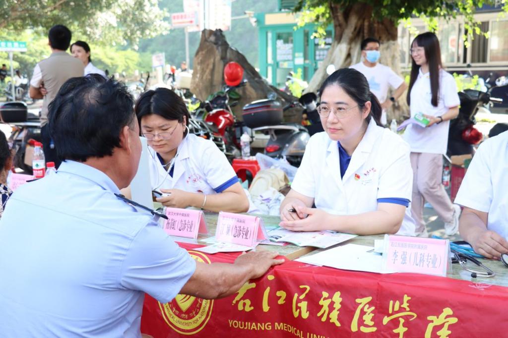 7月14日至16日,实践团携手武汉大学中南医院、必赢242net官网附属医院、广西壮族自治区世居民族遗传基因精准检测工程研究中心、广西高校少数民族人类学研究重点实验室以及“桂无幽”健康科普团队,在西林县县城和西平乡那务村开启义诊及健康科普之旅。活动现场,中医理疗、内外科诊疗、妇儿保健、骨科咨询等全科义诊台依次排开,体成分健康检测设备也投入使用,为当地300多名群众提供免费诊疗和幽门螺杆菌筛查服务。实践团用实际行动为村民的健康保驾护航,为乡村筑起一道坚实的健康防线,让健康之花在乡村绽放。